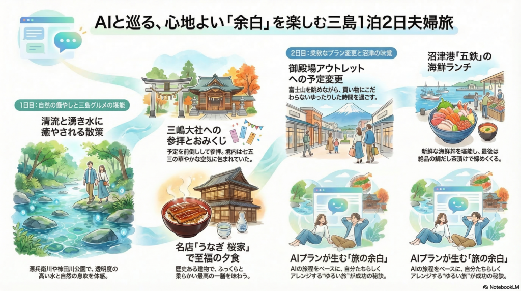 今回は、、AIで夫婦ふたりの三島旅行旅行プランを作成し、実際に体験してみようと思います。