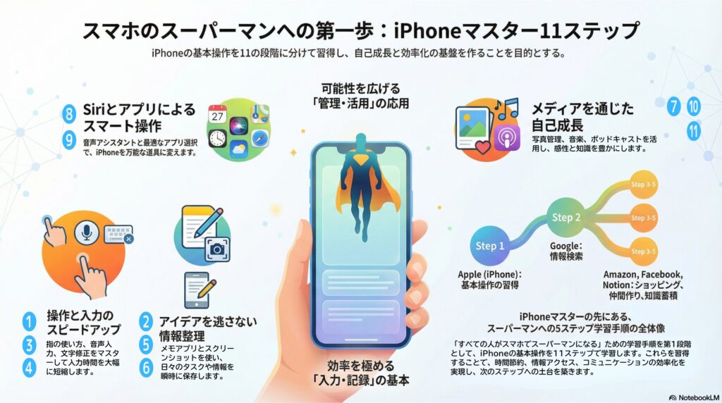 スマホの力を手に入れる第一歩は、iPhoneの基本操作をマスターすることです。日常生活に革命を起こす「すべての人がスマホでスーパーマンになる。」という学習手順を、しっかりと段階的見ていただければ、あなたもスマホでスーパーマンになることができます。