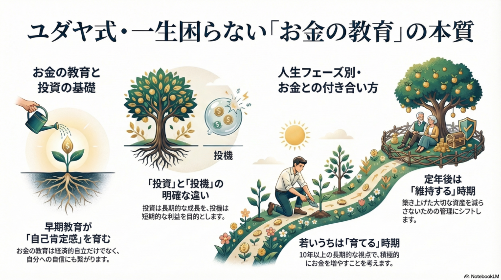 本書では、お金を育てる時期と維持する時期を意識することの重要性が説かれています。若いうちは、お金を育てる時期であり、10年以上の長期的な視点でお金を増やすことを考える必要があります。一方、定年後は、育てたお金を減らさないように維持する時期となります。