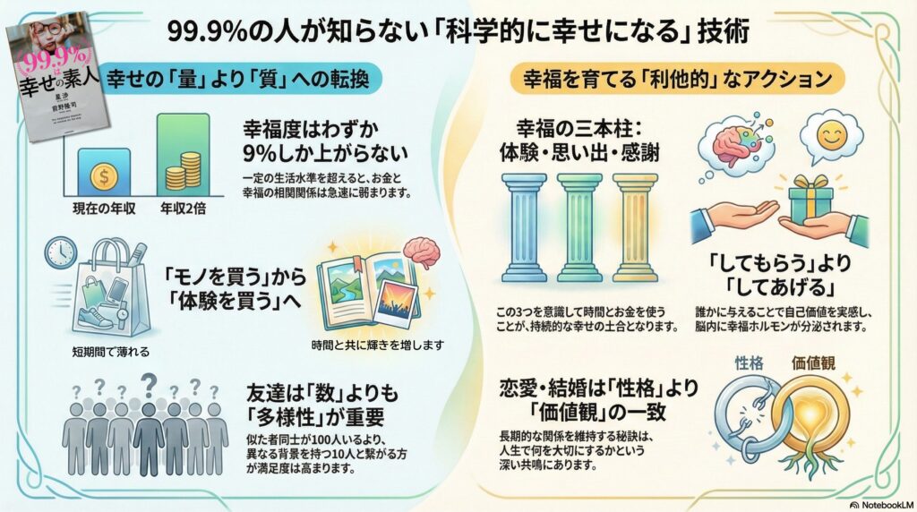 『99.9%は幸せの素人』が教えてくれるのは、幸福は偶然訪れるものではなく、科学的に設計し、育てていけるものだということです。