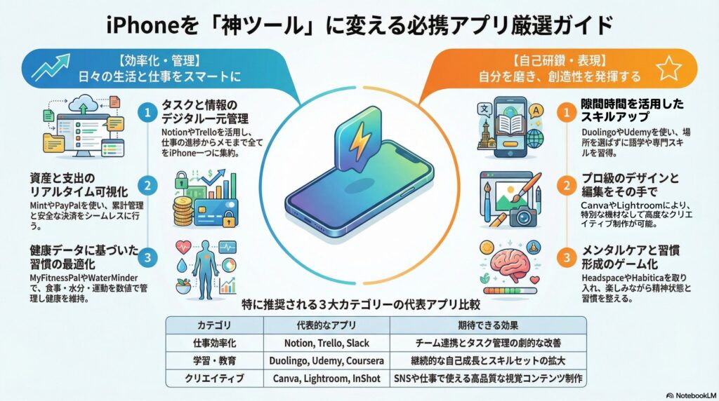 iPhoneで使用できる生活に役立つ神アプリを100個、ジャンル別に紹介します。各アプリの具体的な役立つ場面も簡潔に説明します。
