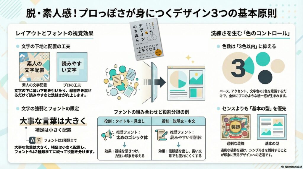 『デザインのきほん』では「色数を3色以内に抑える」ことが基本とされています。