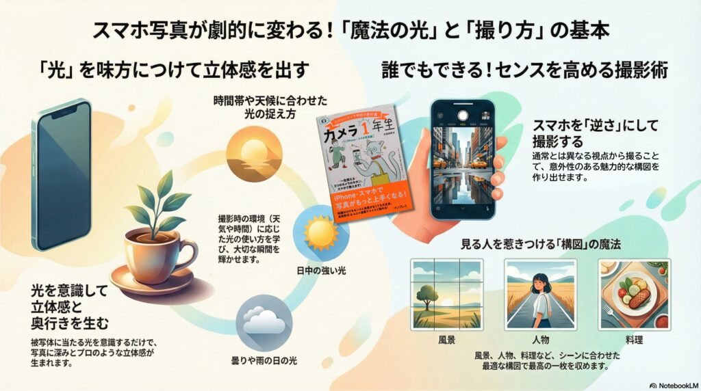 風景、人物、料理、夜景など、どんなシーンでも最高の1枚を収めるための秘訣も公開されています。さらに、スマホを逆さにして撮影する意外なテクニックも紹介されています。