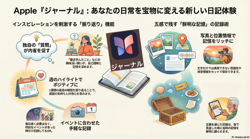 ジャーナルは写真撮影や位置情報を活用し、記憶を豊かにします。写真を添えれば、文字だけでは表現しきれない瞬間をより鮮明に伝えることができ、位置情報からその場所の雰囲気も味わえます。これにより、単なる文字だけでなく、五感を通じて思い出を振り返ることができます。