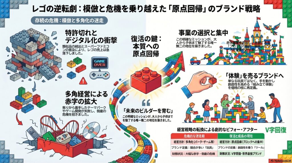 このままではブランドが崩壊してしまう——。レゴが下した決断は「原点回帰」でした。赤字事業を売却し、レゴの本質である「ブロックの製造と開発」に集中することにしたのです。この決断が功を奏し、レゴは見事なV字回復を遂げ、世界最強のブランドへと返り咲きました。