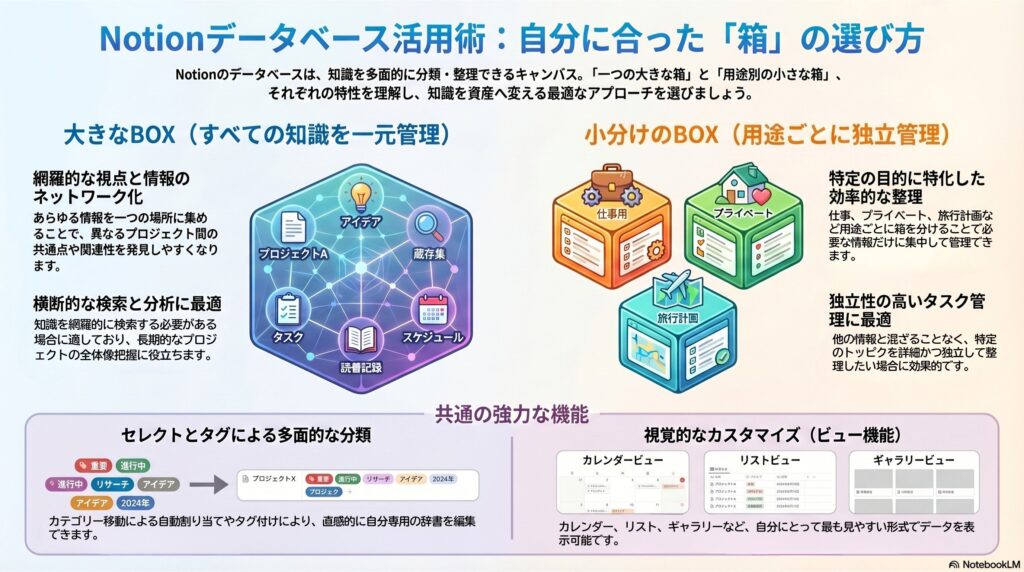 最後に、Notionのデータベースを使いこなすためには、自分の目的や使い方に合った設計を心がけることが重要です。大きなBOXで網羅的に管理するか、小さなBOXで特化して管理するかを適切に選択し、それに基づいてセレクトやタグを効果的に活用しましょう。その結果、あなたの知識は整理されるだけでなく、新たな価値を生み出す資産となるでしょう。