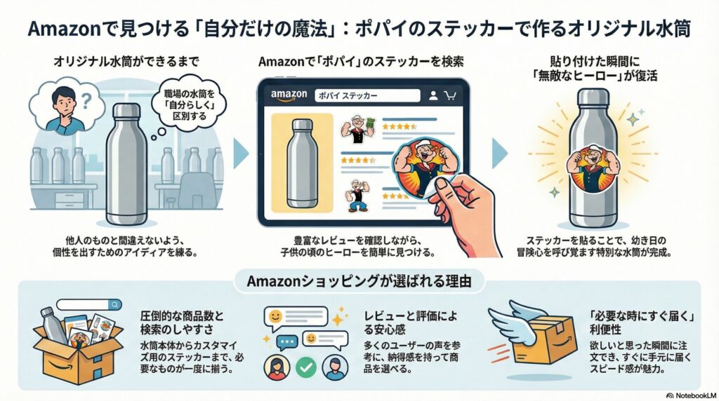 Amazonショッピングで叶えた!私の小さな幸せ、ポパイのステッカーでオリジナリティ溢れる水筒を作ろう