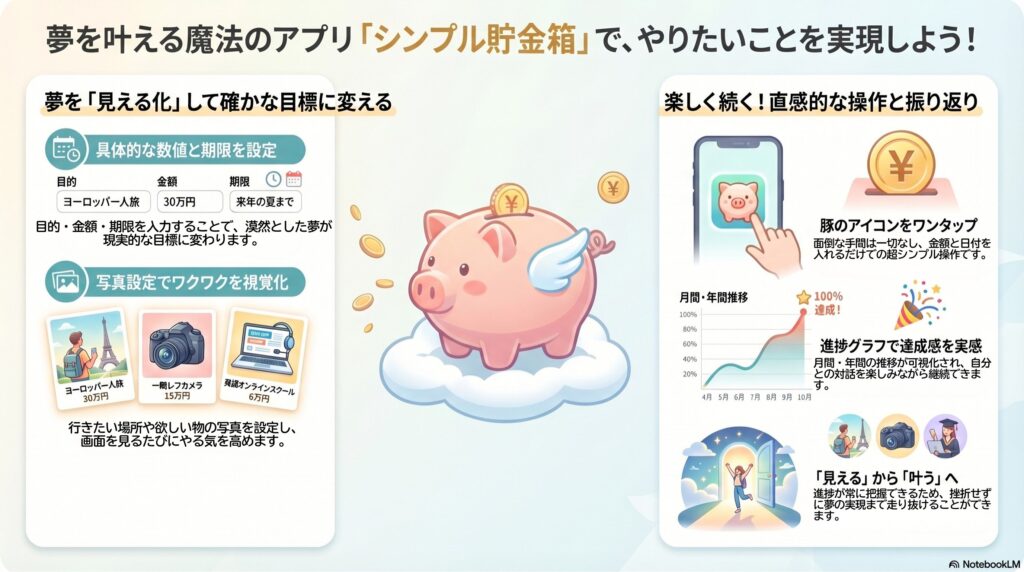 つまり、シンプル貯金箱は「夢を叶えるプロセス」を見て、触れて、楽しめるアプリです。