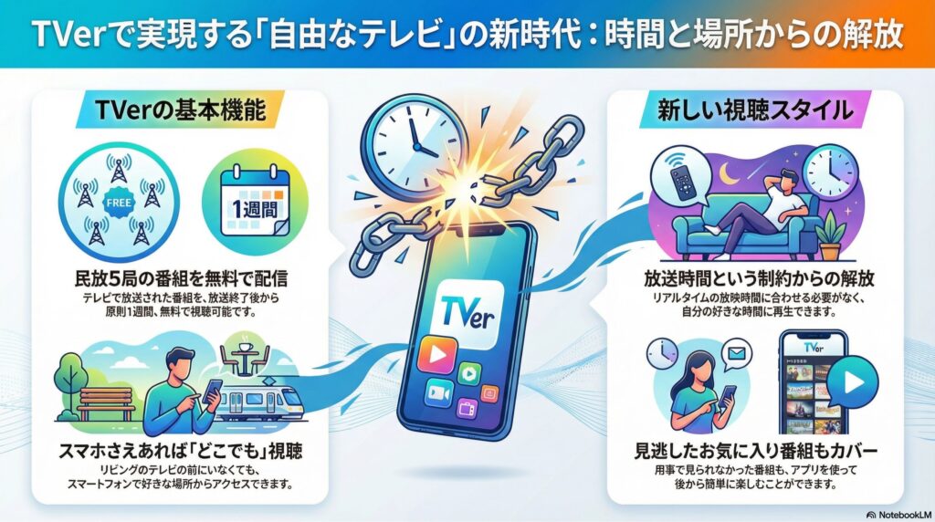 Tverは、民放5局のテレビ番組を無料で見られる動画配信サービスです。テレビで放送された番組を、放送後から一定期間(原則として1週間)無料で見ることができます。