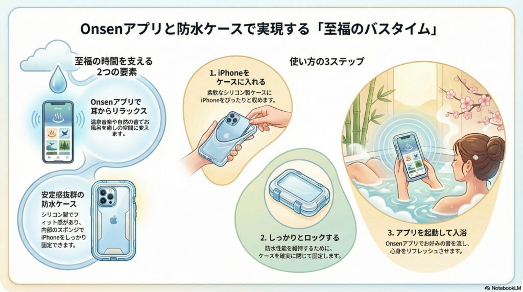 この防水ケースは、Onsenアプリとの相性抜群です。ぜひ、お風呂でのバスタイムをより楽しいものにしてください。
